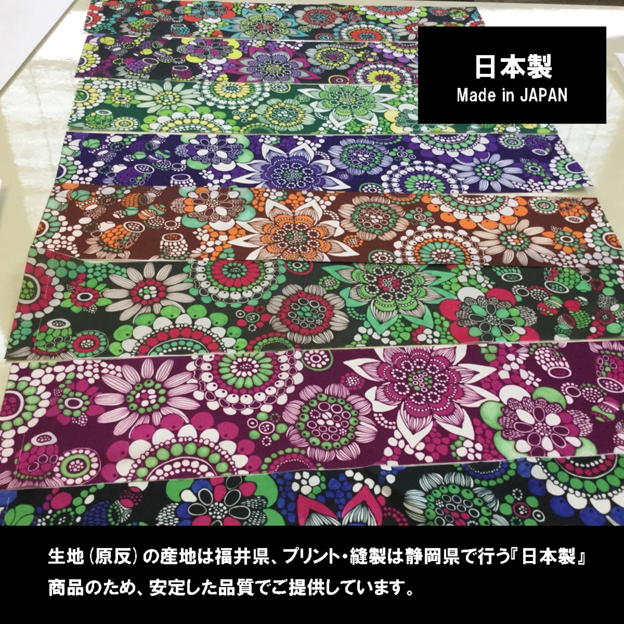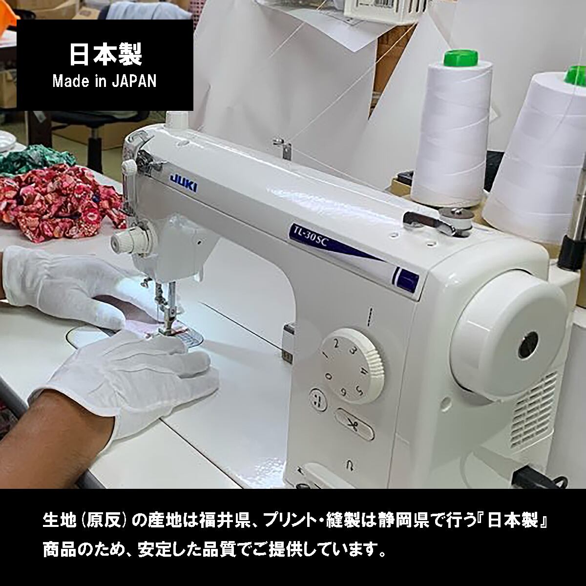生地(原反)の産地は福井県、プリント・縫製は静岡県で行う『日本製』商品のため、安定した品質でご提供しています。