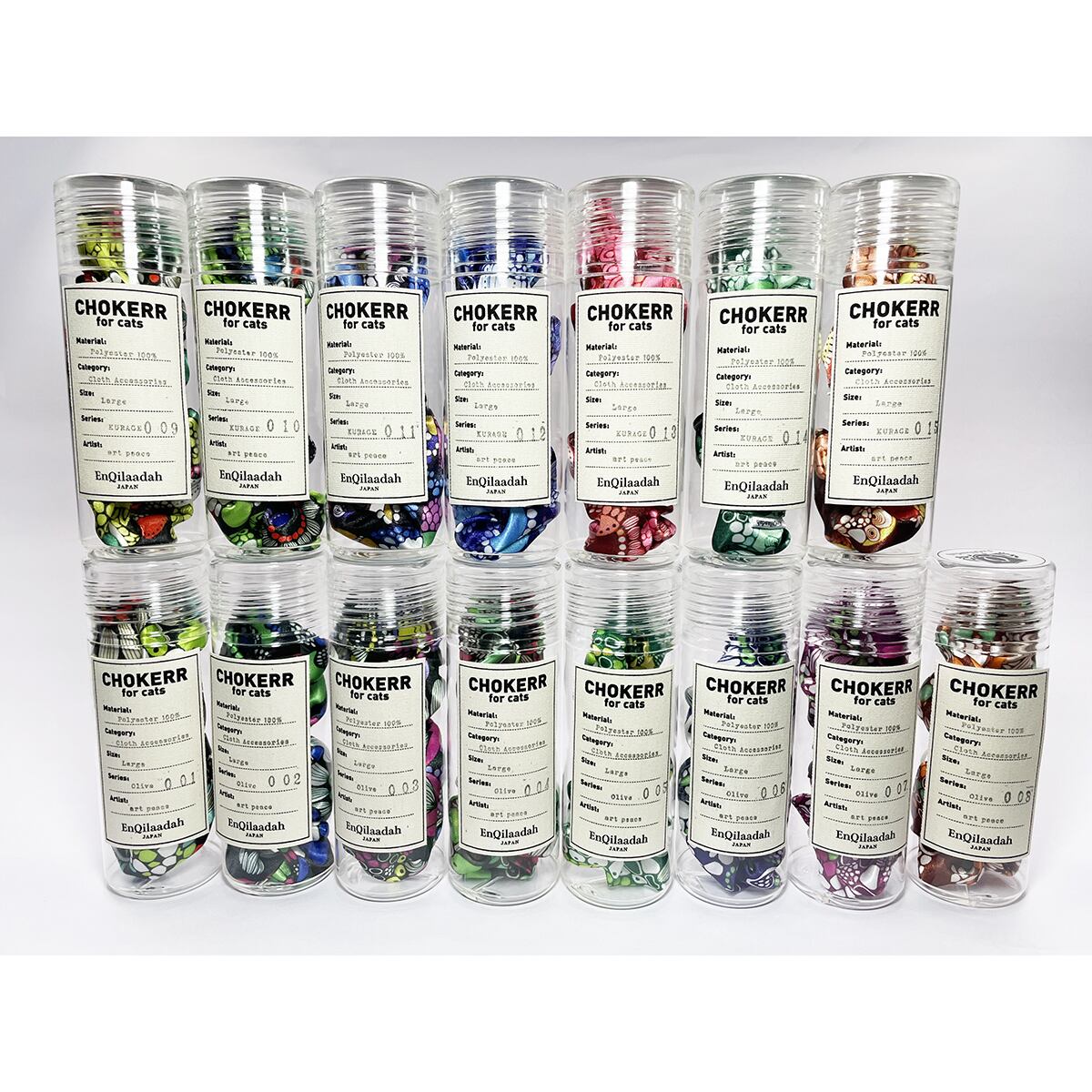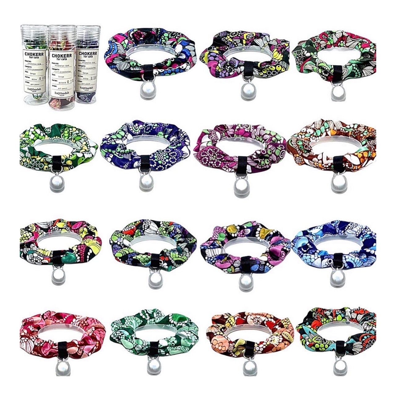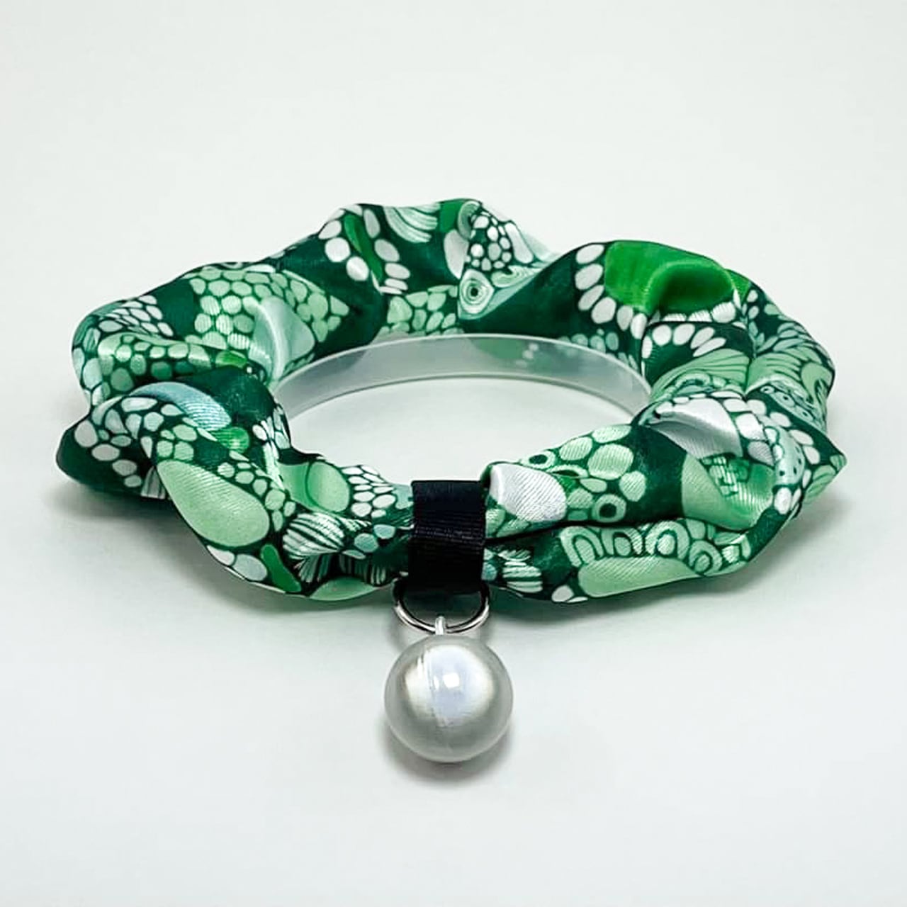 猫のシュシュ首輪【KURAGE柄/グリーン系】 日本製/色落ちしにくい/洗える/軽量/上品な鈴の音/ギフト風パッケージ/014-02