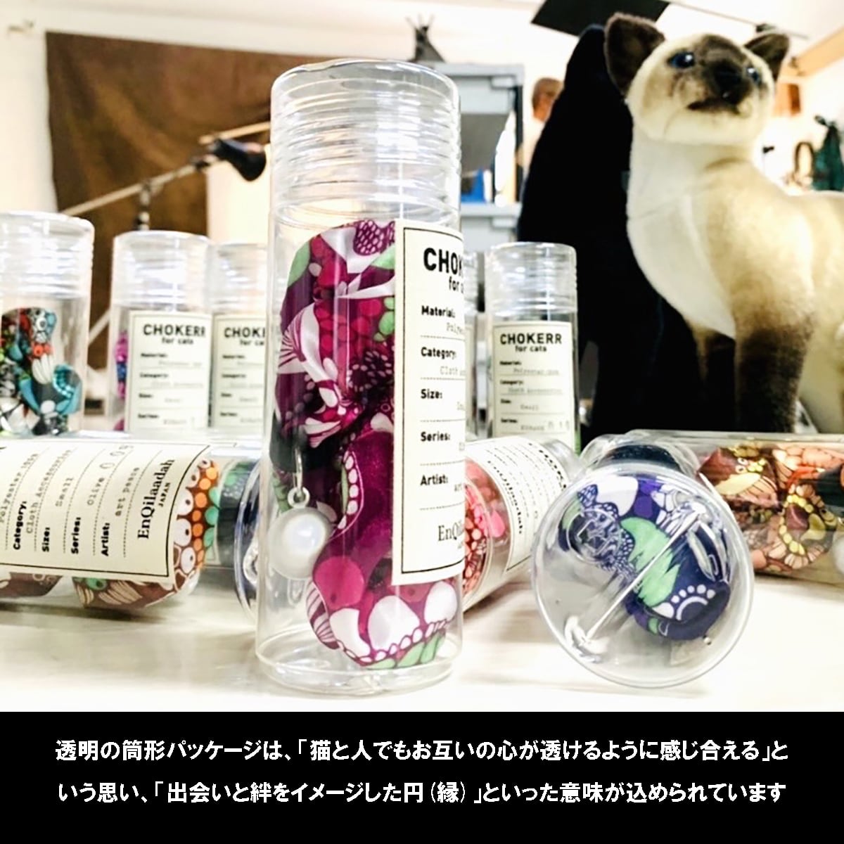 この商品は愛猫へ、また愛猫とともに暮らしている方へのプレゼントとして使ってもらえるように企画した商品です。透明の筒形パッケージは、「猫と人でもお互いの心が透けるように感じ合える」という思い、「出会いと絆をイメージした円(縁)」といった意味が込められています。『贈る・飾る・使う』の場面ごとに幸せを感じられる商品になればうれしいです。