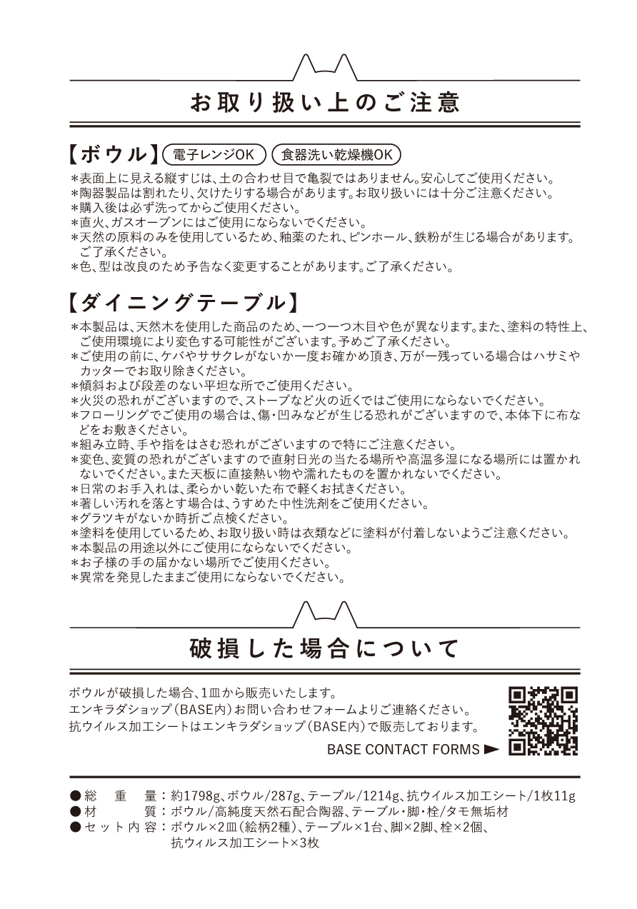 ボウル×2皿(絵柄2種)、テーブル×1台、脚×2脚、栓×2個、抗ウイルスシート×3枚